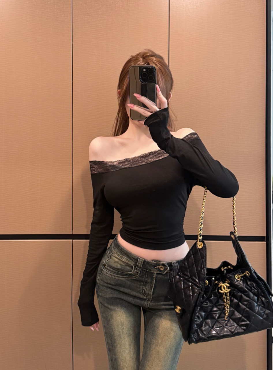 Womens Floral One-Shoulder Lace T-Shirt